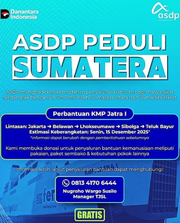 Seluruh bantuan, akan dihimpun dan didistribusikan secara bertanggung jawab sebagai bagian dari komitmen ASDP dalam mendukung percepatan pemulihan bencana di Sumatera.