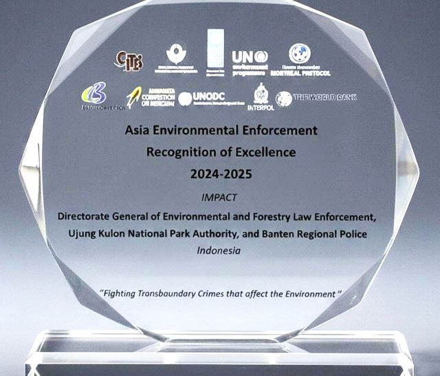 Penghargaan ini, diberikan sebagai bentuk apresiasi atas keberhasilan dan komitmen TNUK dalam upaya penegakan hukum lingkungan, khususnya dalam penanganan kasus perburuan Badak Jawa.