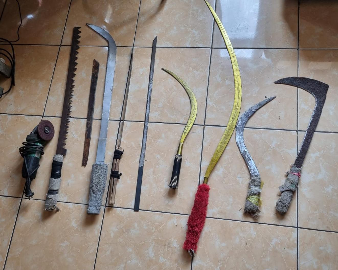Barang bukti yang diamankan berupa Clurit 5 (lima) buah,Pedang 3 (tiga) buah,Pedang gerigi 1 (satu) buah dan Alat gerinda 1(satu)