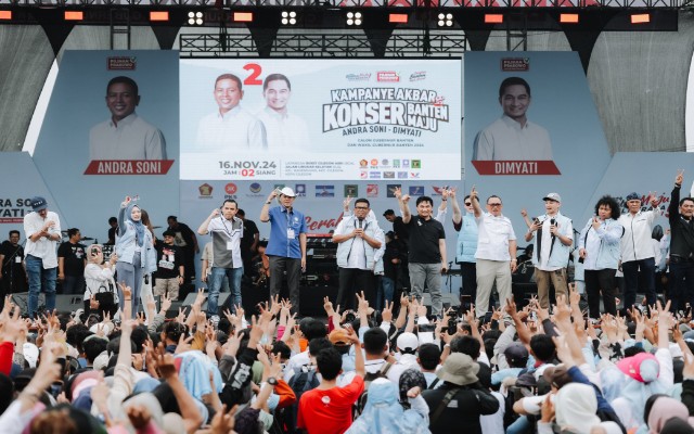 Triberita.com | Cilegon Banten – Pasangan calon Gubernur dan Wakil Gubernur Banten nomor urut 02, Andra Soni-Dimyati Natakusumah, menggelar Kampanye Akbar dan Konser Banten Maju di Lapangan Bukit Cilegon Asri (BCA), Jalan Lingkar Selatan (JLS), Kelurahan Bagendung, Kecamatan Cilegon, Kota Cilegon, Provinsi Banten, pada Sabtu (16/11/2024).
