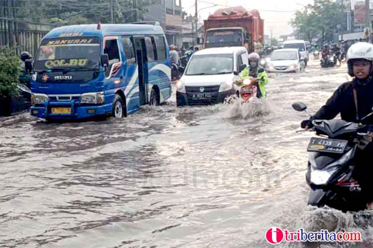 triberitacom – Kab.Bekasi – Hujan deras yang terjadi menyebabkan ruas Jalan Raya Imam Bonjol, Cikarang Barat, terendam banjir, Senin (7/11/22). Akibat genangan air di ruas jalan, mengakibatkan puluhan sepeda motor yang mogok lantaran nekat menerobos banjir. Pengendara motor terpaksa menuntun kendaraannya karena mengalami mati mesin.