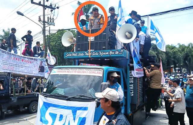 Uniknya, dalam pengamanan kali ini, Kapolres Condro ikut berada di atas kendaraan komando buruh dan ikut panas-panasan mengikuti perjalanan massa.
