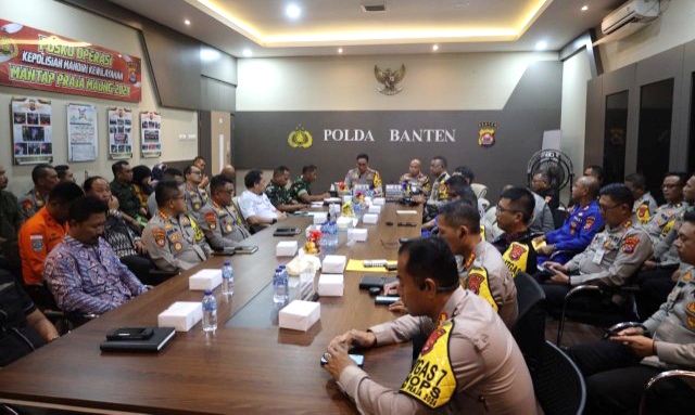 Rapat dipimpin Kapolda Banten Irjen Pol Suyudi Ario Seto, didampingi Wakapolda Banten Brigjen Pol Hengki, PJU Polda Banten, juga dihadiri oleh Kepala Pelaksana Badan Penanggulangan Bencana Daerah (BPBD) Provinsi Banten Nana Suryana, Kepala Stasiun Meteorologi Maritim Kelas 1 Merak Anton Daud serta Kapolres jajaran.