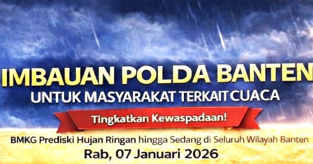 Triberita.com | Serang Banten – Menyikapi prakiraan cuaca dari Badan Meteorologi, Klimatologi, dan Geofisika (BMKG) Banten, Polda Banten mengimbau masyarakat untuk meningkatkan kewaspadaan terhadap potensi cuaca ekstrem dan kondisi perairan yang berpeluang terjadi di sejumlah wilayah Provinsi Banten, pada Rabu (7/1/2026).