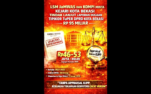 LSM Jamwas Indonesia dan LSM Kompi, mendesak Kejaksaan Negeri Kota Bekasi untuk segera menindaklanjuti laporan dugaan tindak pidana korupsi (Tipikor) terkait penetapan Tunjangan Perumahan (Tuper) Pimpinan dan Anggota DPRD Kota Bekasi Tahun Anggaran 2021–2025.