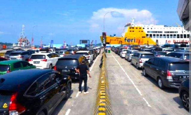 Ratusan kendaraan pemudik, terpantau masih sempat tertahan di setiap area parkiran pelabuhan untuk masuk ke kapal.