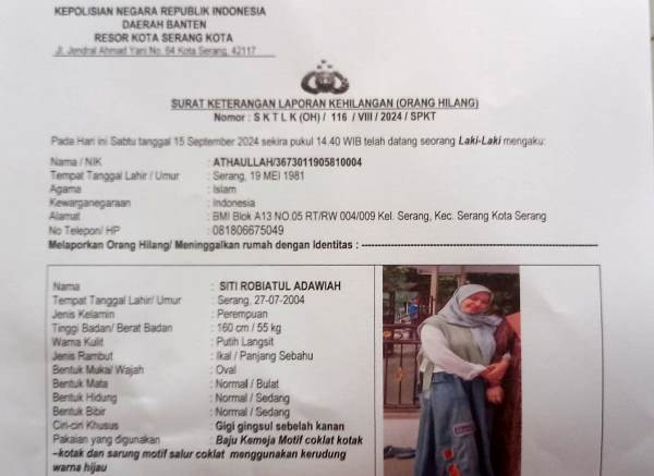 “Waktu pamitan, pada Rabu (11/9/2024) pagi jam 10.00 WIB, anak kami Siti Robiatul Adawiah,, katanya mau kembali ke pondok pesantren tempatnya belajar. Namun pada Jumat malam tanggal 13 September, kami mendapatkan informasi dari pihak pondok pesantren (ponpes), bahwa anak kami belum sampai di ponpes,” ujar Athaullah saat membuat laporan di Polres Serang Kota, Minggu sore (15/9/2204).
