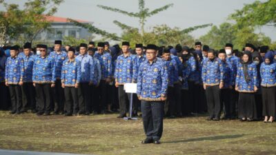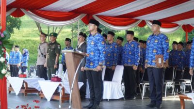 Situasi upacara di hari pertama ASN di Kabupaten Bandung Barat masuk kerja usai libur lebaran Idul Fitri 2023, di pimpin Bupati Bandung Barat, Hengky Kurniawan sekaligus memperingati Hari Otonomi Daerah 2023. (Foto: Forkopim/ Deden).