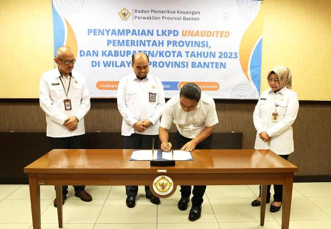 Triberita.com | Serang Banten – Penjabat (Pj) Gubernur Banten Al Muktabar, menyerahkan Laporan Keuangan Pemerintah Daerah (LKPD) Unaudited Provinsi Banten Tahun 2023 kepada Badan Pemeriksa Keuangan (BPK) Perwakilan Provinsi Banten, pada Rabu (7/2/2024) di Aula BPK Perwakilan Provinsi Banten.
