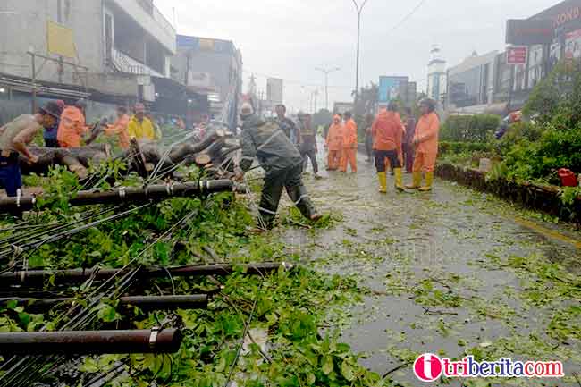 Petugas dari Badan Penanggulangan Bencana Daerah (BPBD), pemadam kebakaran, dan personel TNI dan Polri yang mendatangi lokasi, berusaha membersihkan batang pohon yang menutup badan jalan.