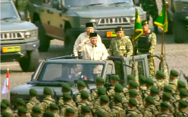 Presiden Prabowo, dalam pemeriksaan pasukan Upacara Peringatan HUT ke-80 TNI, didampingi oleh Menteri Pertahanan Sjafrie Sjamsoeddin, Panglima TNI Jenderal Agus Subiyanto, dan komandan upacara. Pemeriksaan dilakukan menggunakan kendaraan Maung tanpa atap.