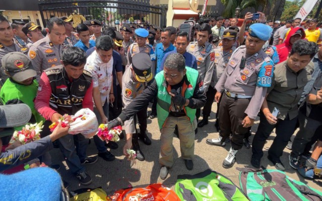 Triberita.com | Serang Banten – Sebagai bentuk keprihatinan atas peristiwa yang menelan korban jiwa Ojek Online (Ojol) di Jakarta, ratusan orang dari Komunitas Ojol di Provinsi Banten menggelar aksi solidaritas dan tabur bunga di depan Mako Polda Banten.