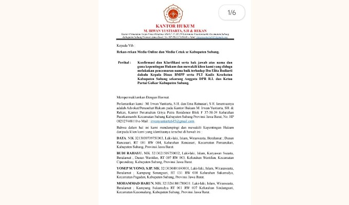 Triberita.com | Subang – Metro Buana, sebuah media online di Kabupaten Subang, memberikan tanggapannya atas somasi yang dikirimkan Irwan Yustiarsa dan Ema Ratna Sari, Kuasa Hukum dari pihak yang dirugikan nama baiknya akibat pemberitaan hoaks.