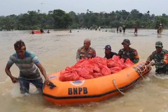 Dengan berjalan kaki dibantu personil BPBD dan TNI, Kapolres Serang, mendorong perahu karet milik Badan Nasional Penanggulangan Bencana (BNPB) yang dipenuhi paket sembako menuju perkampungan penduduk.