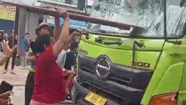 Warga memecahkan kaca truk dengan melemparkan batu, kayu balok besar, dan sempat melakukan sweeping.