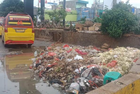 Pengguna jalan mengeluhkan bau tak sedap yang keluar dari sampah yang terlihat bercampur air tersebut, yang merupakan sampah sayuran dari pasar tumpah simpang SGC Cikarang Utara pada malam hari.
