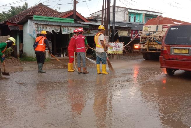 Humas PT Adhi Acset KSO, Robert selaku menyampaikan, tim nya melakukan pembersihan Jalan Raya Serang Baru di Desa Sukaragam itu utnk mengantispasi terjadinya kembali kecelakaan akibat tanah merah dari Proyek Jalan Tol