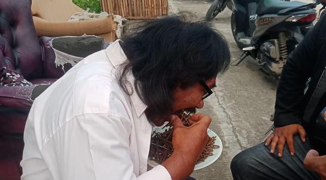 Pria tersebut pun sehari-harinya sudah terbiasa memakan paku. Bagi dia, makan sepiring paku sama seperti makan sepiring nasi.